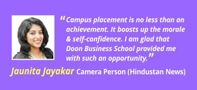Media education cannot be imparted only in classrooms. We at DBS strongly believe in extensive industry interaction. Students visit Newsrooms, production houses, studios and printing press to gain a first-hand knowledge about the process. In addition to industry visits, every student of mass communication is attached to a media industry like Advertising Agency, News Channels, Newspaper Publishing House and Production Houses at the end of the year where they spend 30 days working for that organization. This helps in a smoother transition from a student to a mass communicator phase.PLACEMENTS